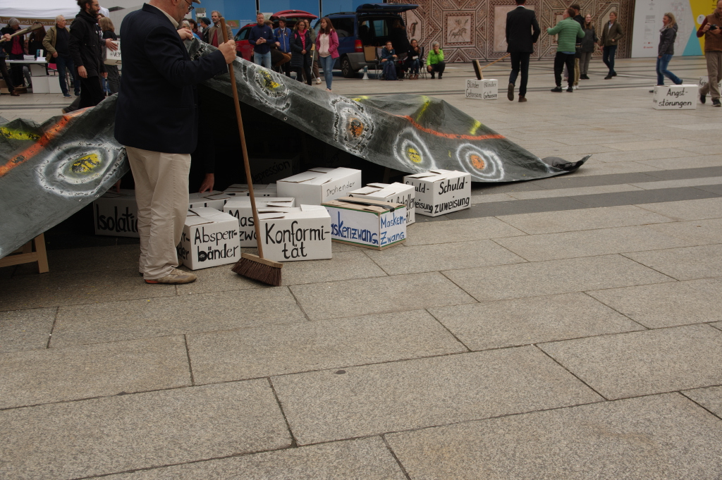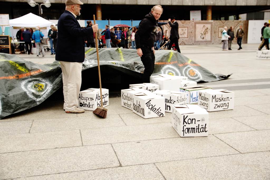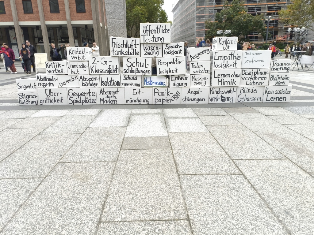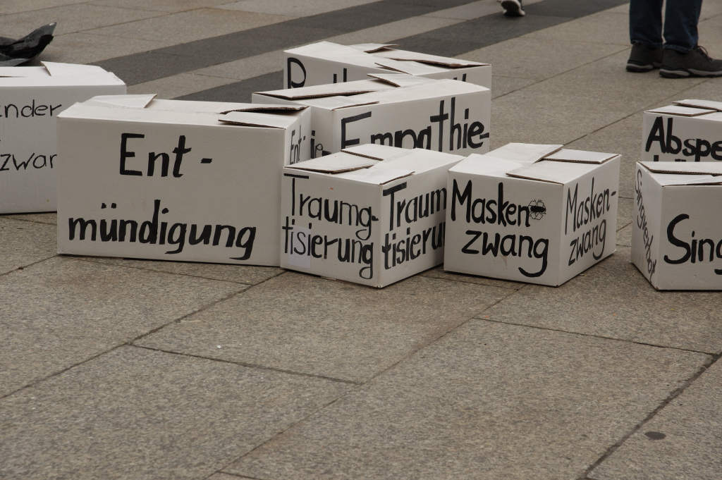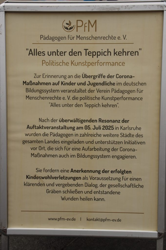 Aktionismus haben sich am 11. Oktober 2025 die Pädagogen für Menschenrechte15 mittels einer politischen Performance am Dom zugetraut und gezeigt, wie alles aus dieser ungeheuerlichen Zeit für Kinder und Jugendlichen unter den Teppich gekehrt wurde. Wir brauchen mehr solche Aktionen, auch für Erwachsene. Wenn die Artikel eins bis fünf aus dem Grundgesetz weggeworfen werden, dann fällt das Wort Demokratie voll und ganz in die Bedeutungslosigkeit.
