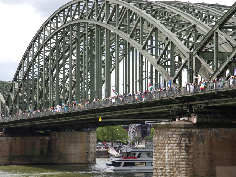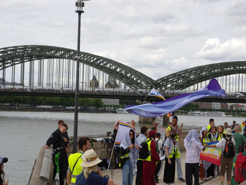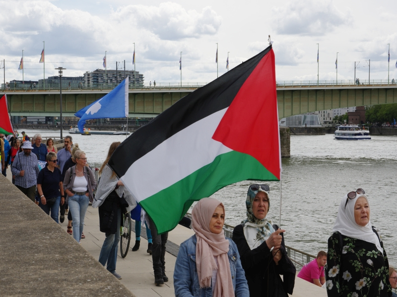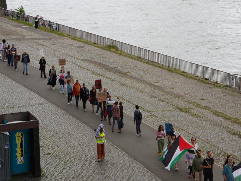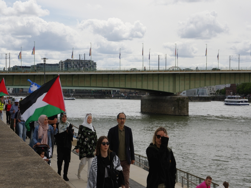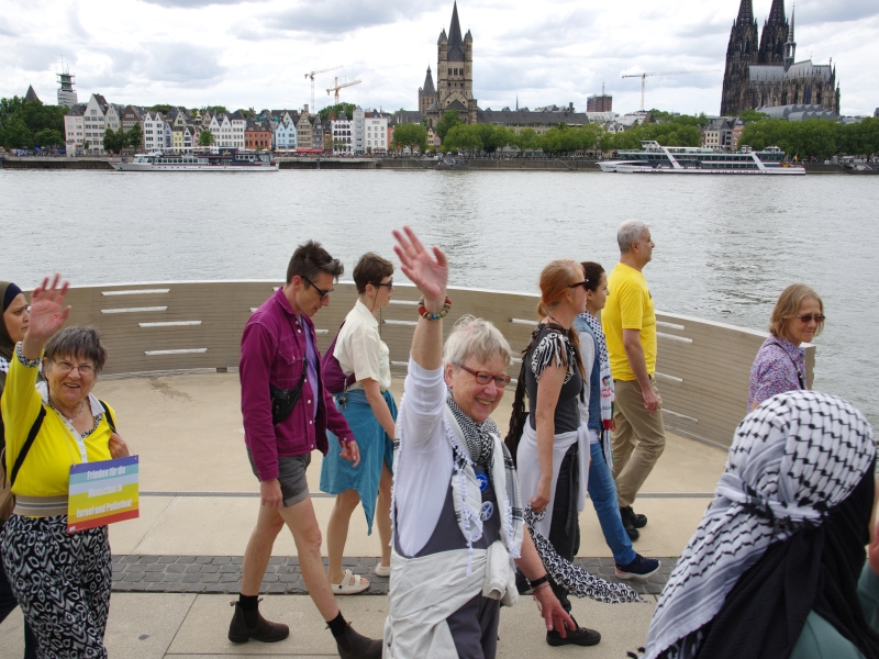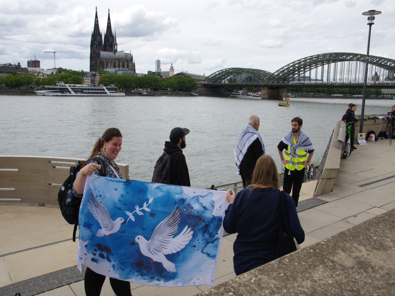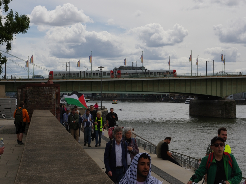 Am Sonntag, 7. Juli 2024 haben Friedensorganisationen wie die palästinensische Gemeinde Köln, Städtepartnerschaftsverein Köln-Bethlehem e. V., das Kölner Friedensforum, Partnerschaftsverein Bonn-Ramallah e. V. und die ärztliche Friedensorganisation IPPNW eine Menschenkette für den Frieden am Deutzer Werft organisiert.