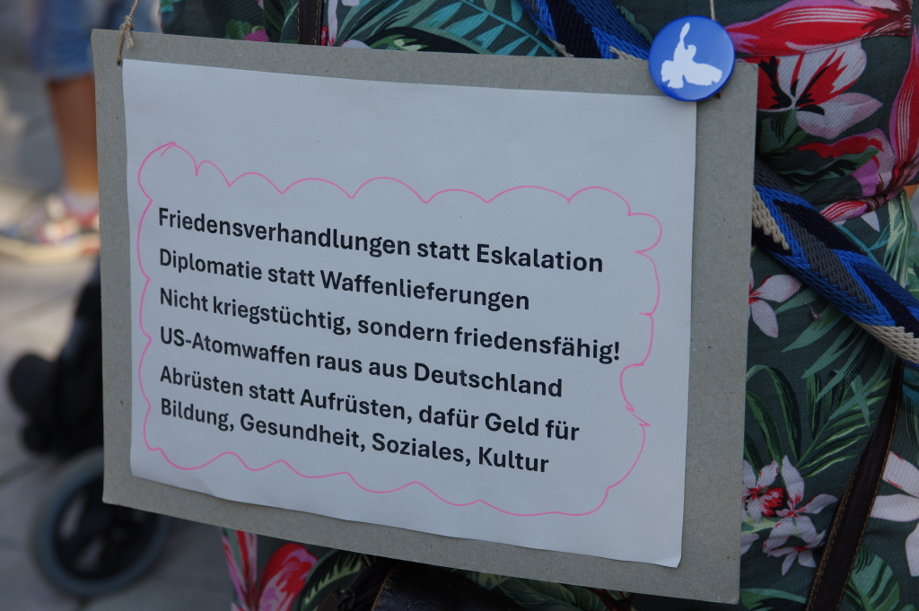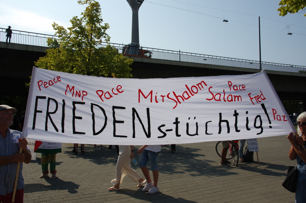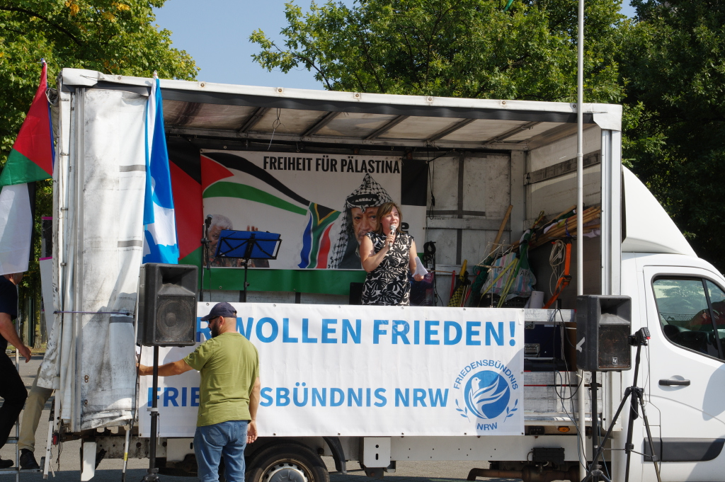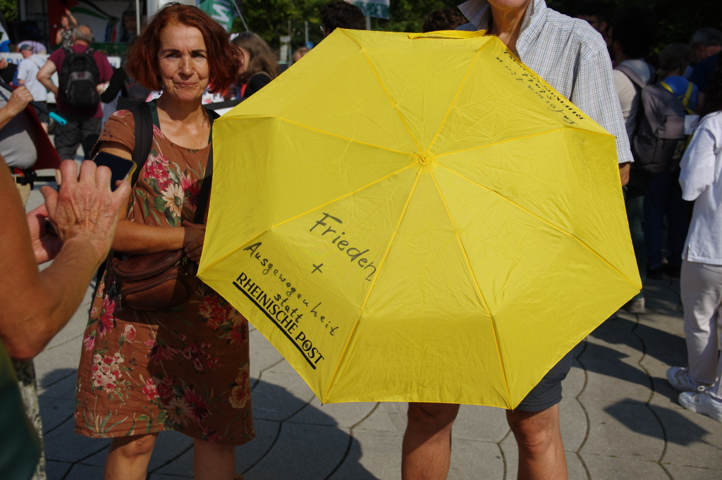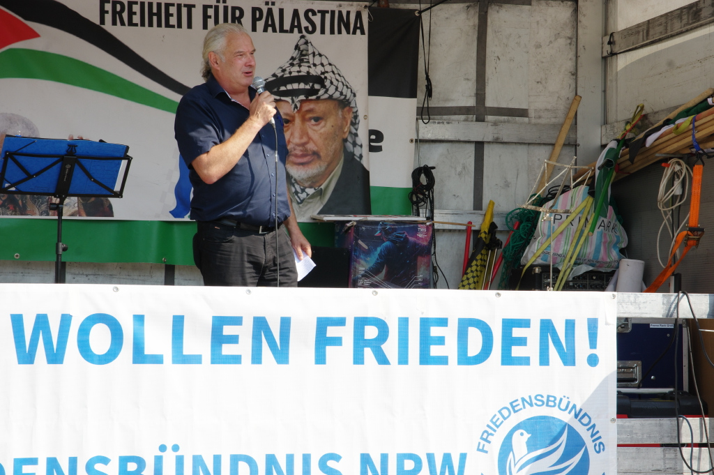Impressionen aus der Kundgebung in Düsseldorf am 31.08.2024. Unter dem Motto: Sie wollen den Krieg. Wir wollen Frieden!!! „Stopp aller Waffenlieferungen in Kriegsgebiete! Verhandeln statt schießen! Diplomatie und Frieden mit Russland – Stoppt Wirtschaftskrieg und Sanktionen! Keine Kriegstüchtigkeit! Schluss mit Demokratieabbau und Militarisierung der Gesellschaft!“ hat das Friedensbündnis NRW aufgerufen. Die Redner waren: Christiane Reymann (Berlin), Andrej Hunko (MdB aus Aachen) und Wa’el Jaber (Deutsch-Palästinensischer Freundschaftskreis Düsseldorf).