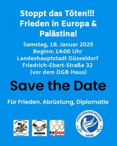 Unter dem Motto „Zusammen für Frieden. Jetzt!“ startet die Vernetzungsinitiative Frieden am 28. Dezember 2024 ihren ersten Tag gemeinsamer Aktionen. Gleichzeitig ruft sie das kommende Jahr 2025 zu einem Jahr des Friedens aus. Rund 40 Initiativen der traditionellen und der neuen Friedensbewegung aus dem Grundrechtespektrum haben sich bisher unter diesem Label zusammengeschlossen, um gemeinsam – „zusammen!“ – ihre dringenden Anliegen in der Bevölkerung sichtbar zu machen. In Wiesbaden, Köln, Konstanz und an weiteren Orten finden unterschiedliche Aktionen statt.