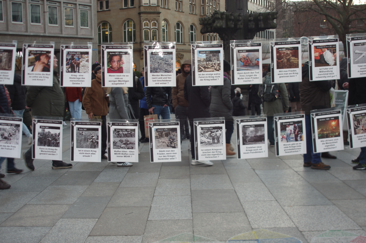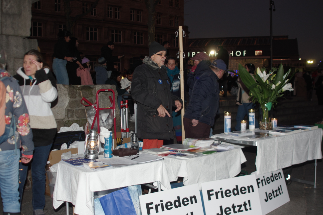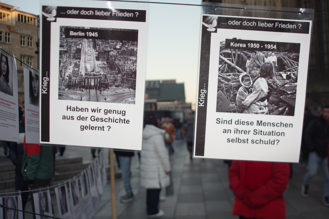 Unter dem Motto „Zusammen für Frieden. Jetzt!“ startet die Vernetzungsinitiative Frieden am 28. Dezember 2024, genau am Tag der unschuldigen Kinder, ihren ersten Tag gemeinsamer Aktionen. Die Basis AG Frieden1 hat zu dieser Mahnwache samt Installation in Köln aufgerufen.